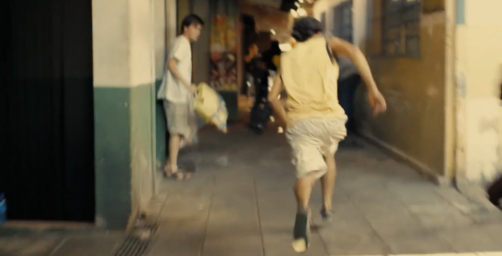 There’s a bird’s-eye-view, we see them speed through the market’s tin roof tops. Then the camera is positioned on the ground, filming their feet as they run.